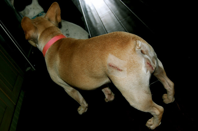 In the meantime, the goal is keep Syd and Hunter from licking her (hot pink) stitches and playing…  otherwise she has to get The Cone.