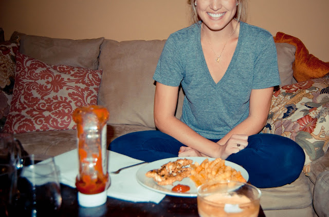 The weather is changing and so are our appetites. Warm comfort food is starting to sound good so I turned to Cooking Light for some new fall recipes (preferably easy and ones that call for ingredients we have around the house). This recipe made the cut so we gave it a whirl… chicken fingers + spicy dip and baked fries on the side.