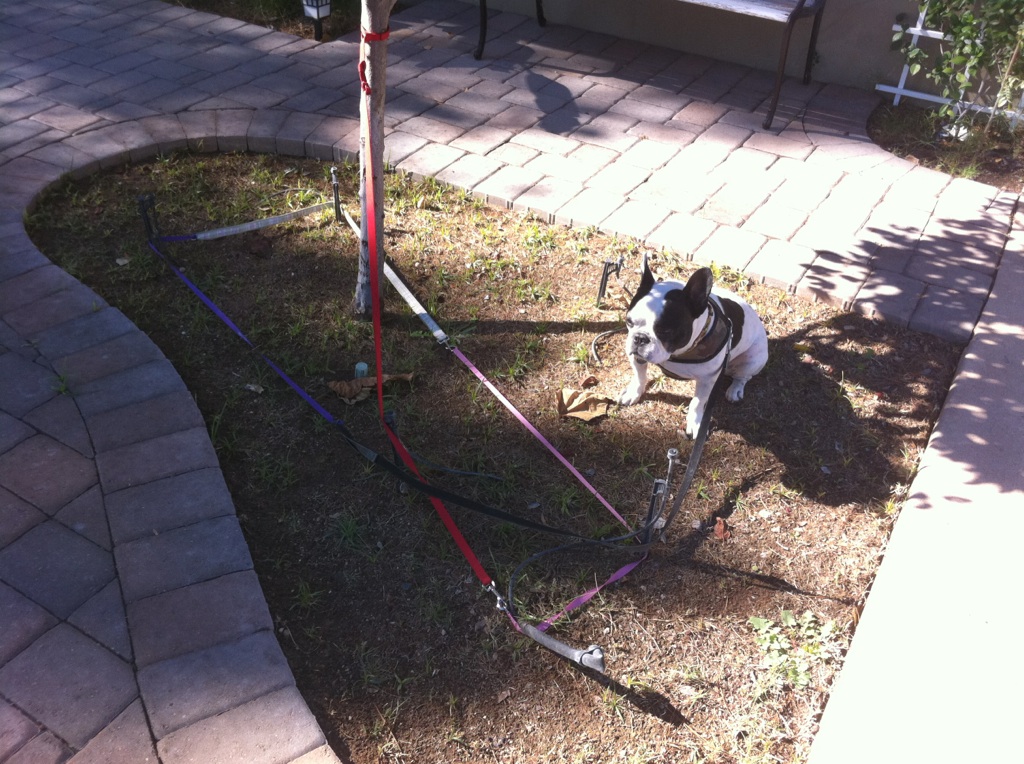 3. Huntie in quite the tangle with the extra-long leash we created so he could hang with us in the front yard. We created a monster. He loved all the action in the front yard – bikers, walkers, dogs, cars – and now it’s his favorite spot to hang out. He cries at the door to be let into the front yard.