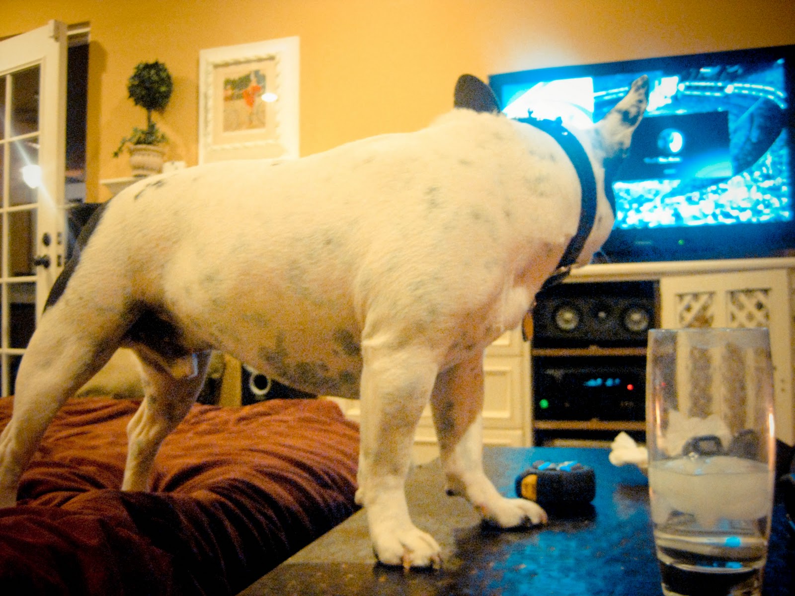 {our dog with no manners watching the super bowl… and climbing on the coffee table for scraps}