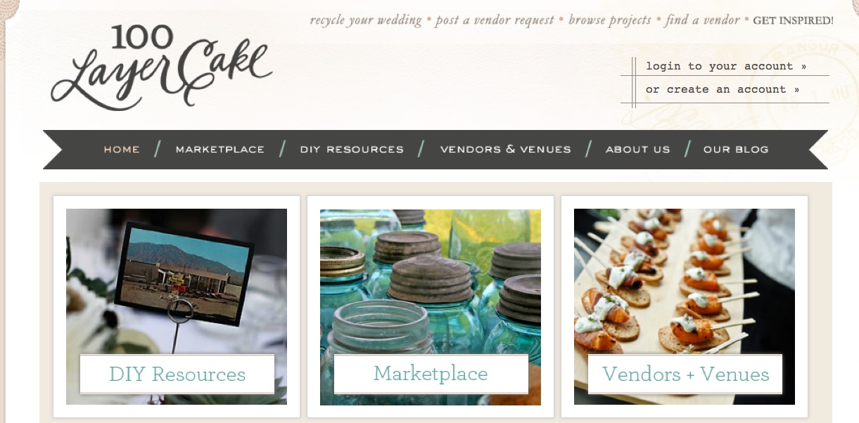 Well, now I have a solution! Funny how that happened. Last night I bumped into an awesome website to solve all these problems. The site is called 100 Layer Cake and in addition to what most wedding blogs offer – DIY ideas and vendor recommendations – this site is a marketplace for brides to recycle their no longer needed wedding things & DIY projects. Who needs 100 different pieces of vintage china? Or 40 apothecary jars? Brides-to-be… that’s who!