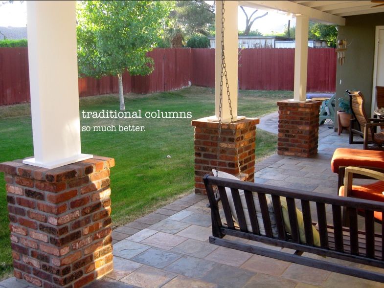 When we had the brick columns built for the white picket fence in our front yard (seen here), we decided to carry the brick look into the backyard by turning the ugly, metal poles holding up our back porch into traditional brick columns (Danny loves all my fun ideas).