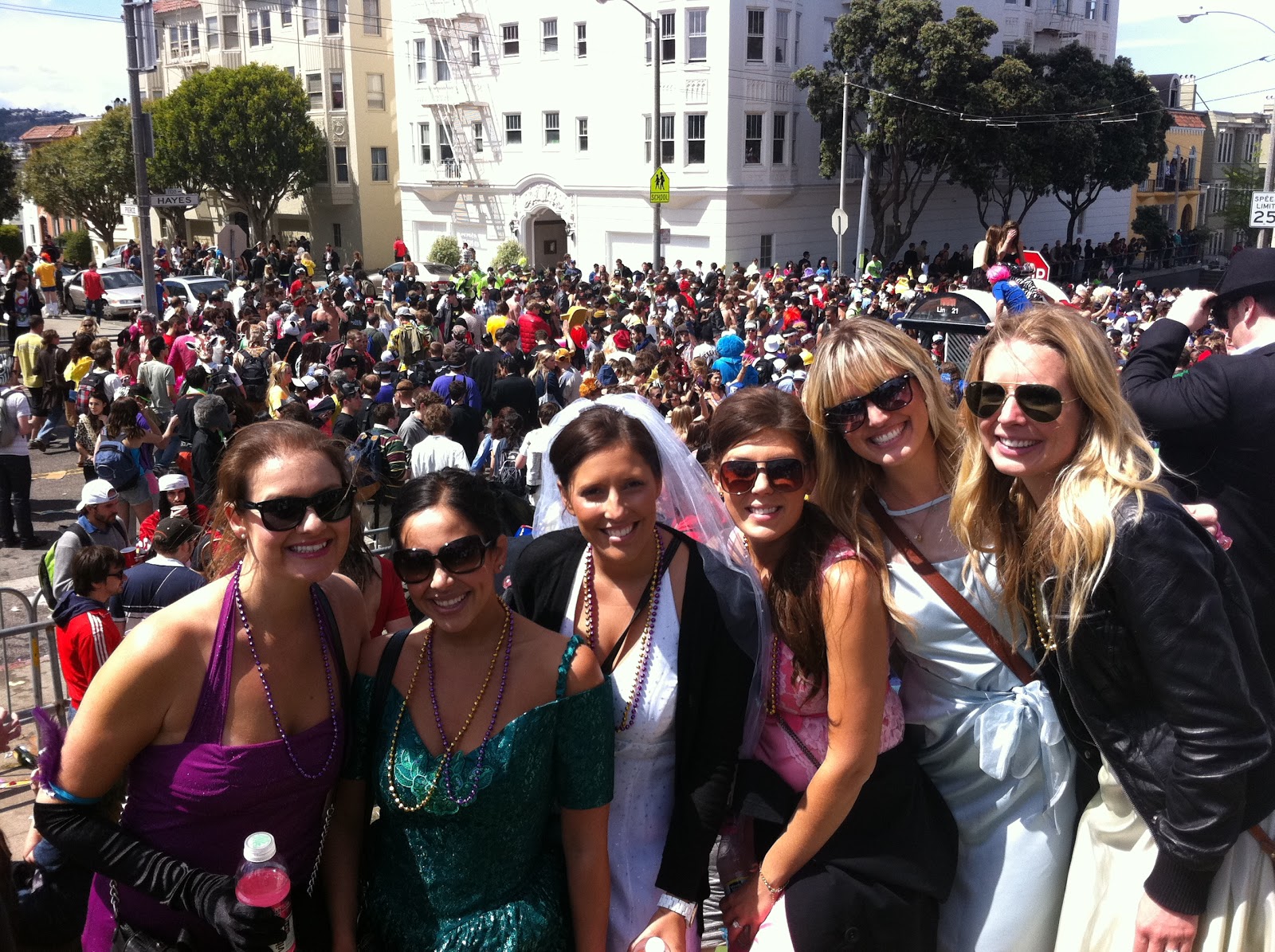 After the bachelorette festivities concluded, six of us girls stayed an extra night to participate in the 100th Annual Bay to Breakers, a 12K race known for people wearing crazy costumes and even running nude. Friends who’ve participated said it’s unlike any event in the country and one of the best days in San Fran – and it did not disappoint. We started early, saw some crazy sights and partied in the Haight-Ashbury district. Keeping with the bachelorette theme, we dressed Tiffany up as a “runaway bride” and we were her tacky bridesmaids – all wearing dresses with tennis shoes. Personally, I thought we looked more like Sister Wives, but you can decide after seeing the handful of blog appropriate photos I have.