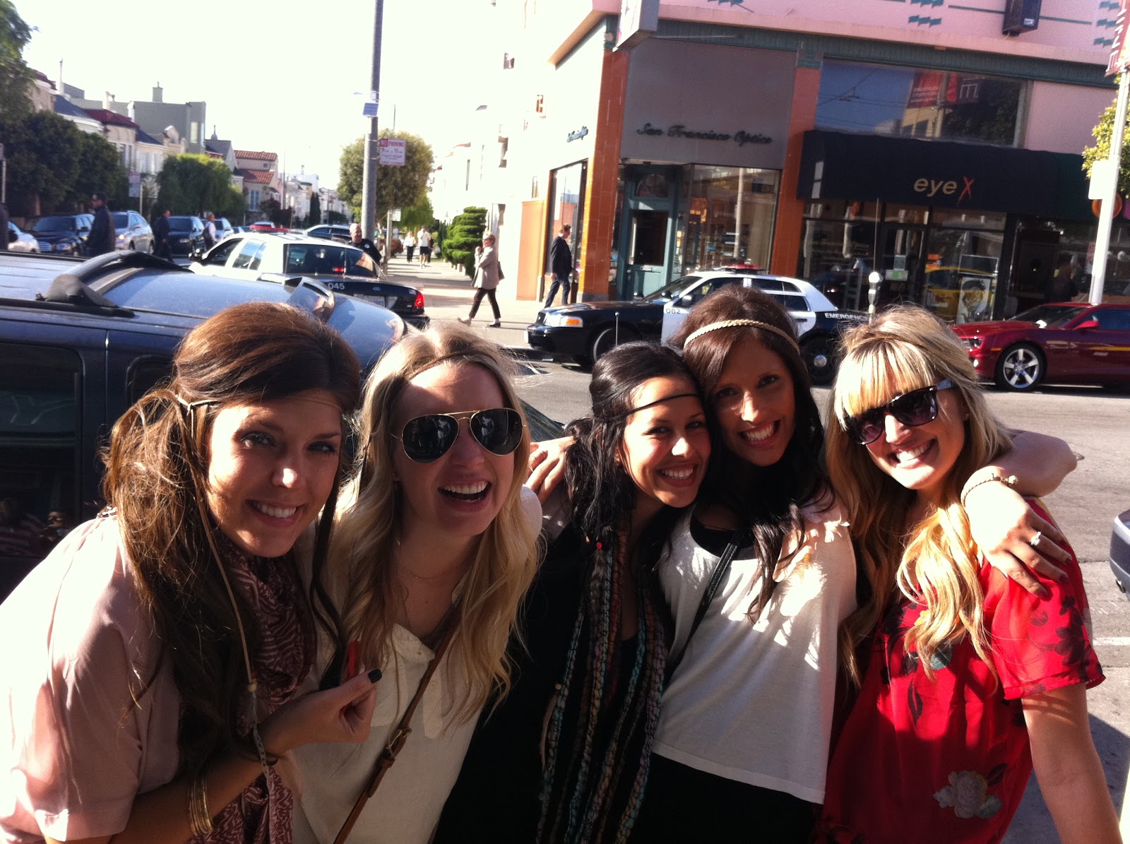 Last Friday, I headed to San Francisco for Tiffany’s bachelorette weekend! Colby planned everything and the itinerary was ridiculously fun – lunches, brunches, sushi dinners, bachelorette games and lots of dancing. All 17 (yup!) of us stayed at The Clift hotel, ate sushi at Umami, pizza from Pizzeria Delfina, had cocktails at The Tipsy Pig, the Redwood Room, Delaney’s dive bar, danced at Le Colonial, enjoyed a bottomless mimosa brunch at Circa Lounge all while playing a scavenger hunt through the city. True to Tiffany’s current style, we stuck with a “tribal” theme – feathered headbands, pow wows and sacrificing things for our chief.