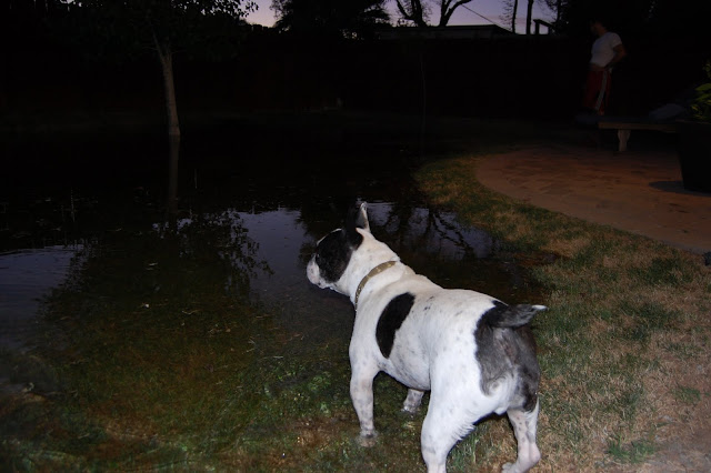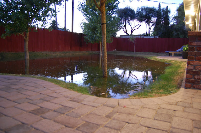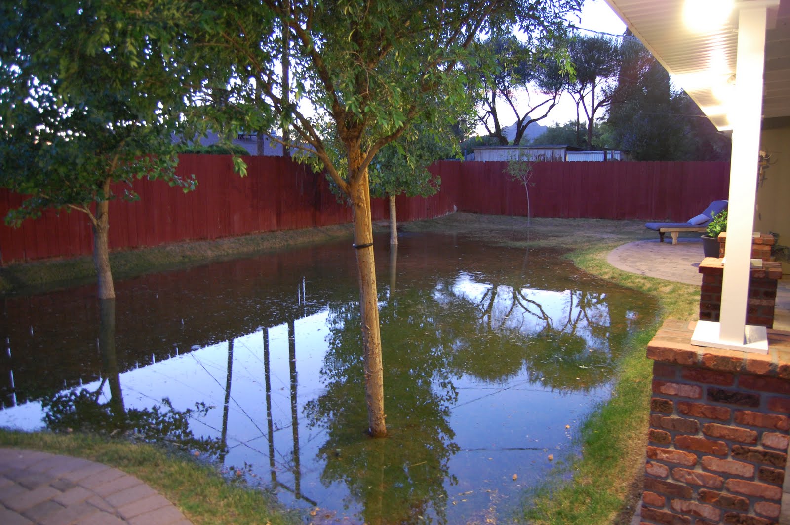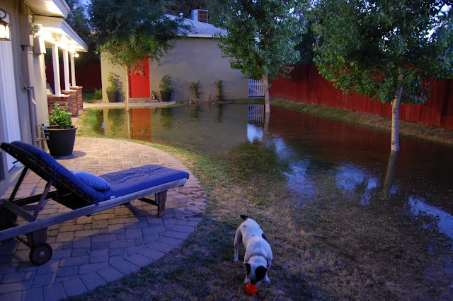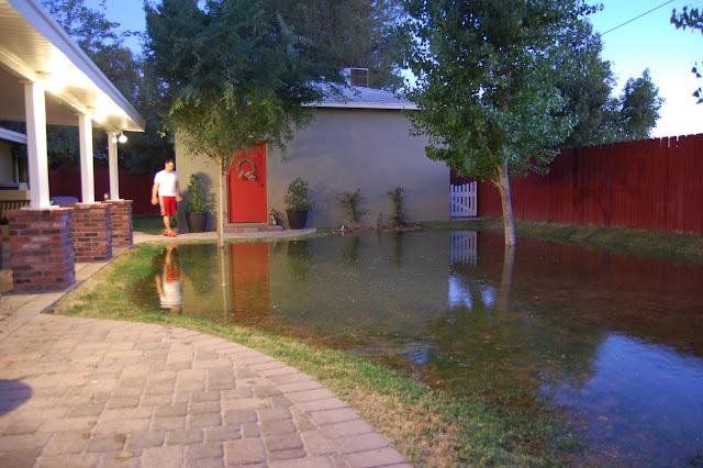 {this is at the beginning of the flood. the entire yard disappears under water}