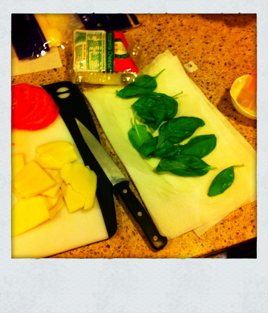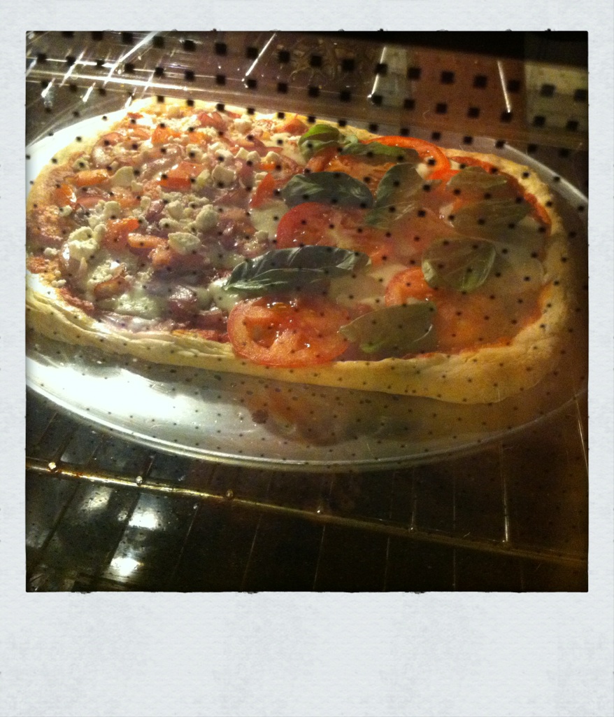 When I told Danny I was going to do sauce, a light sprinkling of shredded mozzarella cheese, sauteed red onions in olive oil, big chunks of tomato and then feta cheese crumbles on top he made the “ew gross” face, said it sounded pretty weird and that there was no chance I’d win.