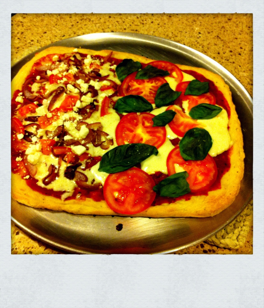 This time around, we decided to have a pizza war. We could each decorate half the pizza with anything we wanted, have a taste-off and then determine who’s combo was better.
