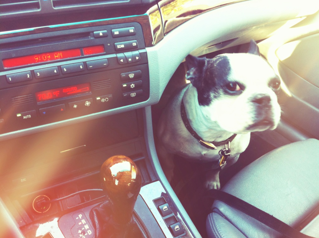 Now this… during this morning’s ride to Paw Play he decided to sit on the floor of the passenger seat and look at me with this strange look. Um, okay? Whatever dude.