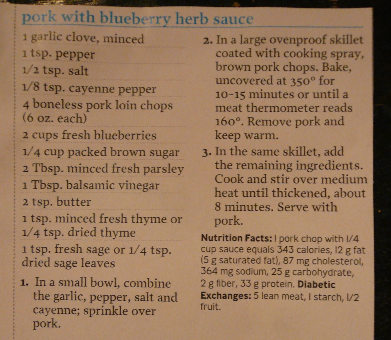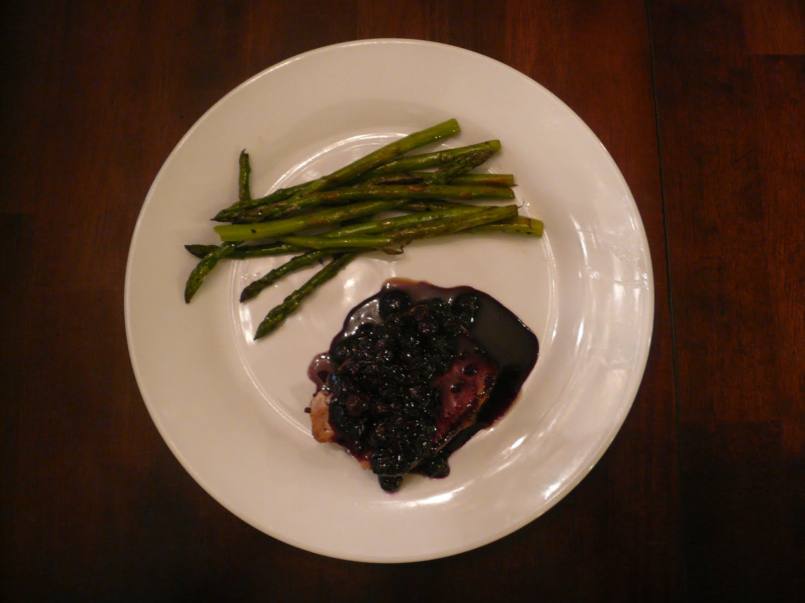 I’ve been looking for recipes that use all the fresh berries that are in season (and so cheap) right now. I was flipping through a new healthy cooking magazine (thanks for the subscription, mom!) when a recipe for Blueberry & Herb Pork caught my eye. It made me think of a delicious blueberry filet my girlfriends and I had years ago at a little restaurant in Florence, Italy called Acqua Al 2 (strangely it’s also in San Diego and DC).