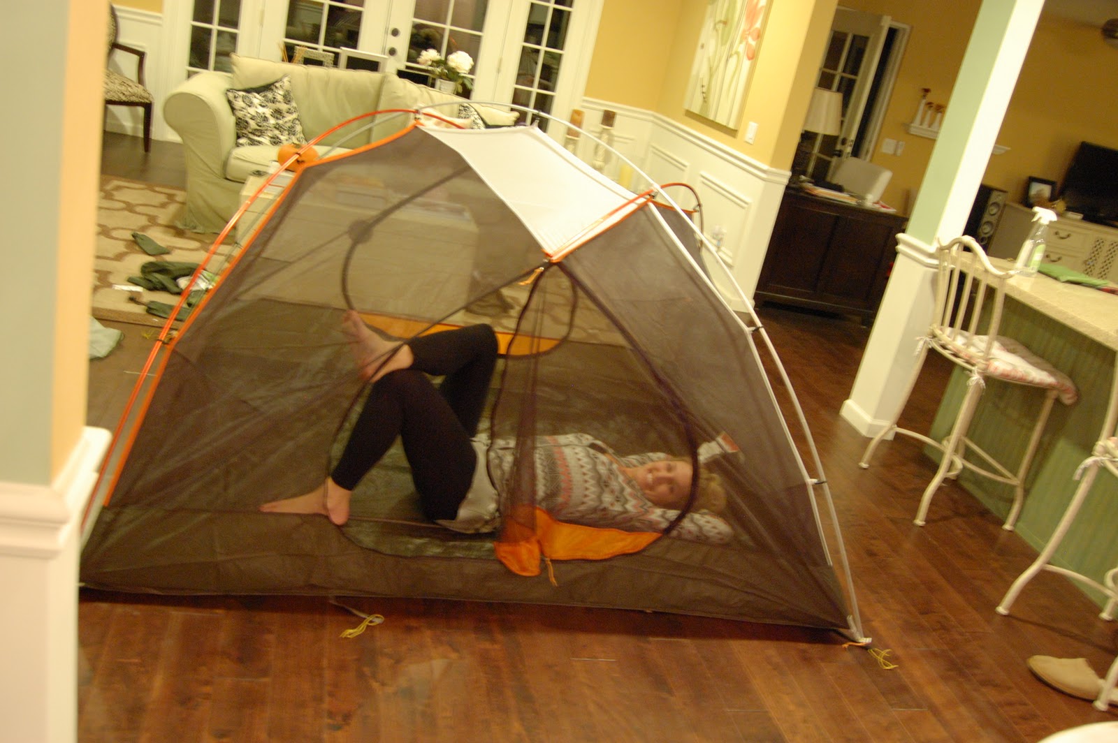 a box arrived with ting’s new tent so obviously it had to be set-up in the house. why yes dear of course we needed a new tent. you know, because we’re always camping (not!)