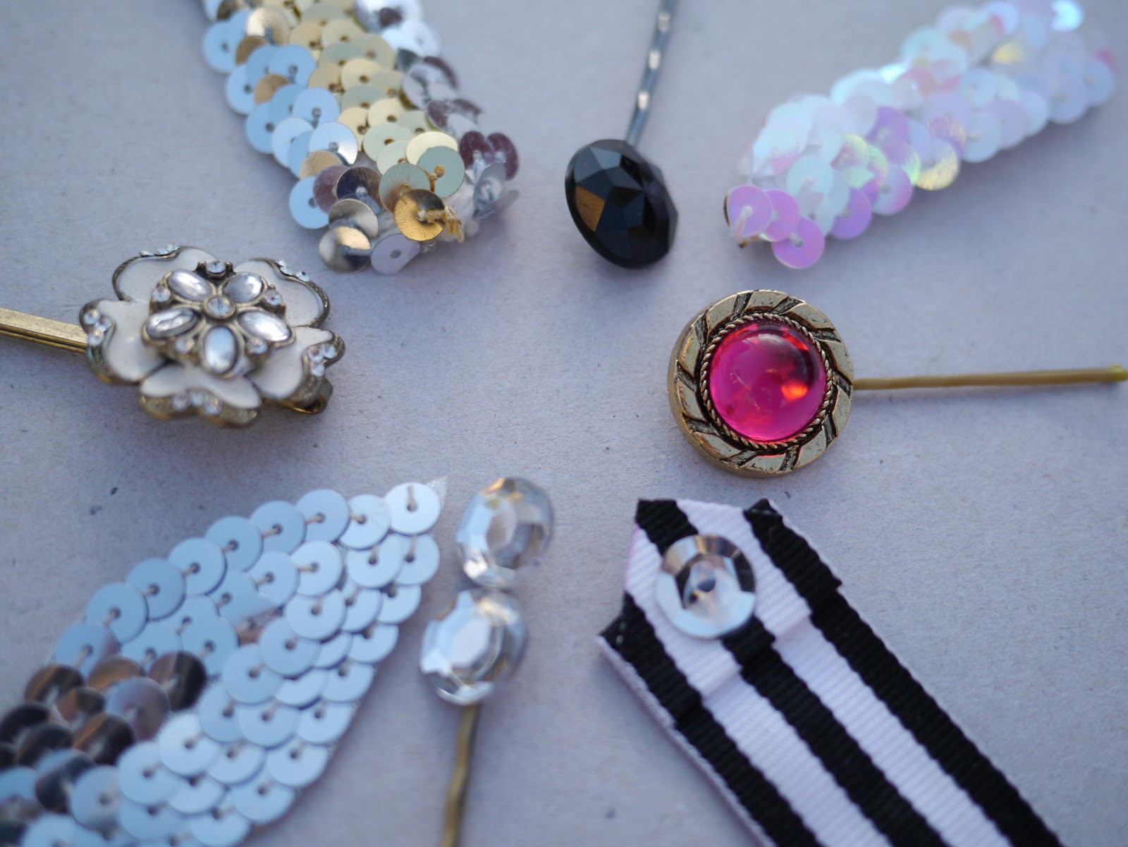 {my new bobbi pins using a variety of materials. get creative. tie bows, wrap with ribbon or do a single sequin}