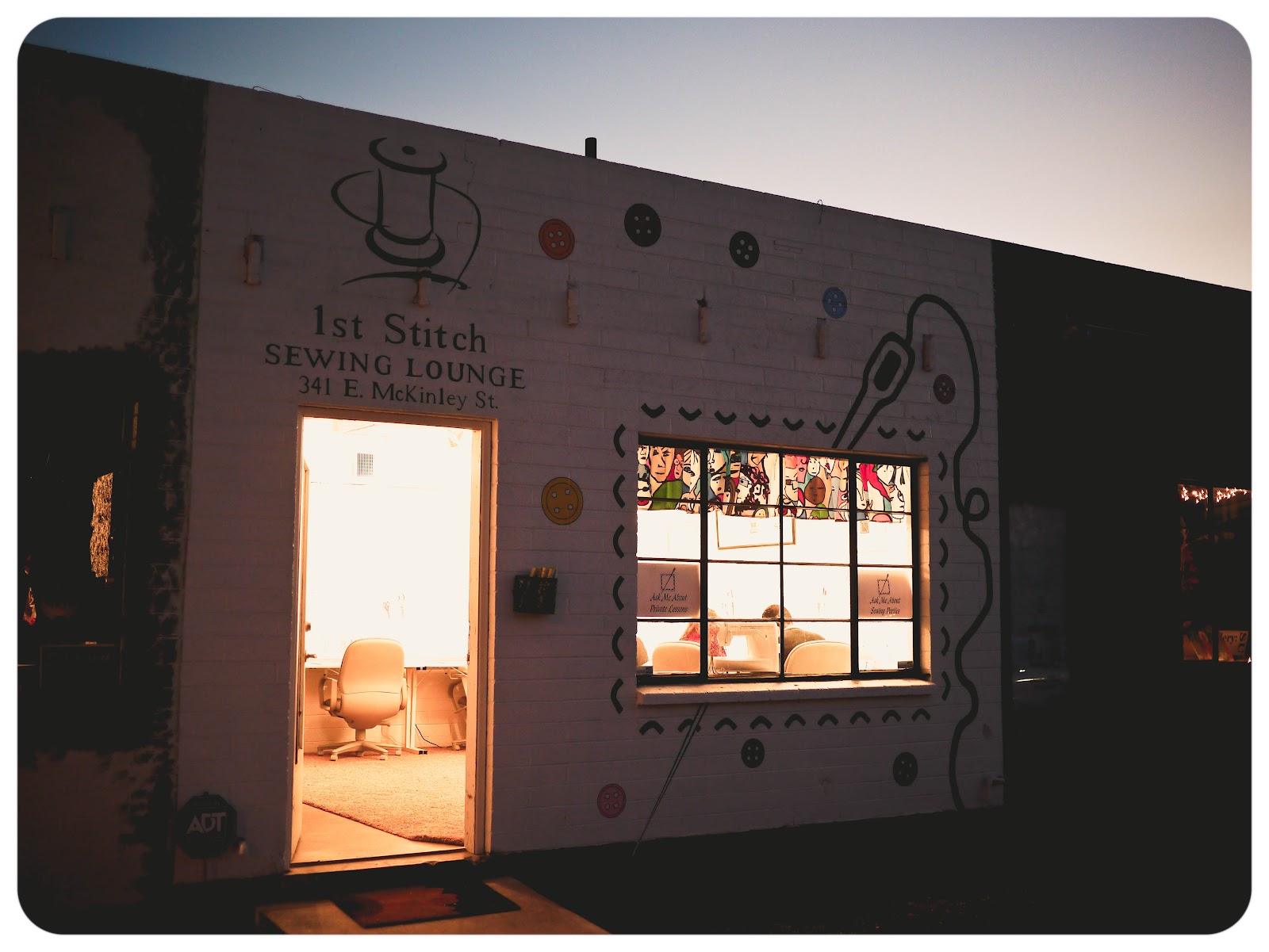 well, while we were at this First Friday’s Artwalk in Downtown Phoenix i saw 1st Stitch Sewing Lounge and immediately cruised in to inquire. the owner, Tina, explained that you can rent space ($10/hour) to sew your own projects or take a variety of sewing classes. consideirng i was in the midst of my nine-week sabatical, the timing was perfect so i signed up right away for the next beginners class.