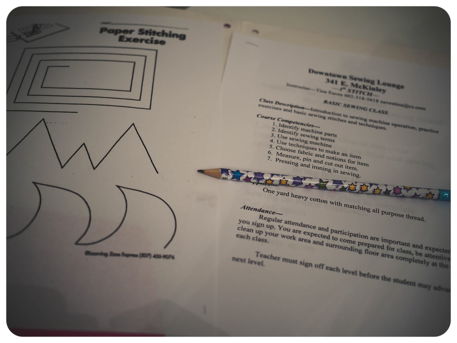 the class was three weeks long, two hours each class. $10 for the first class and $20 for the following two classes for a total of $50 for a 6-hour basic sewing class. sounds good to me! me and my three classmates we went from stitching paper to making a full blown apron in just three weeks. we learned basic machine use, stitching, measuring, fabric pressing and how to follow a basic pattern.