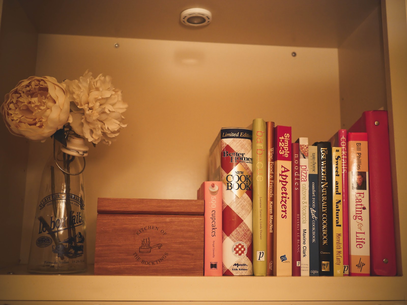 one of my favorite parts of the kitchen. an open nook above the microwave for accessible recipe book storage
