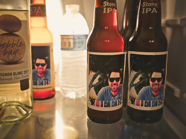 {i surprised ting with a fridge full of beer with custom birthday labels from Pinhole Press}