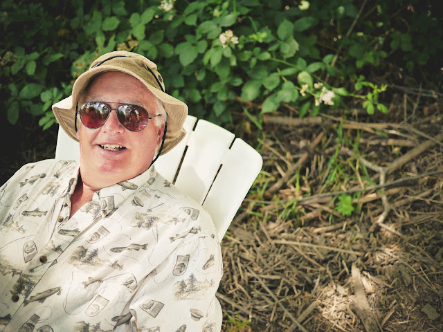 fishing hat. fish on his shirt. you think this man likes to fish?