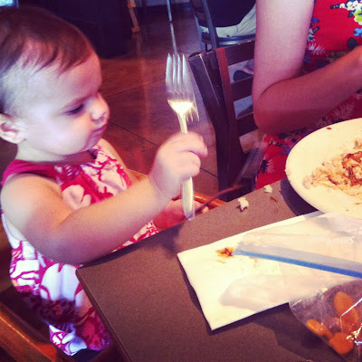at just 16-months the little lady is miss independent and uses a fork to feed herself,