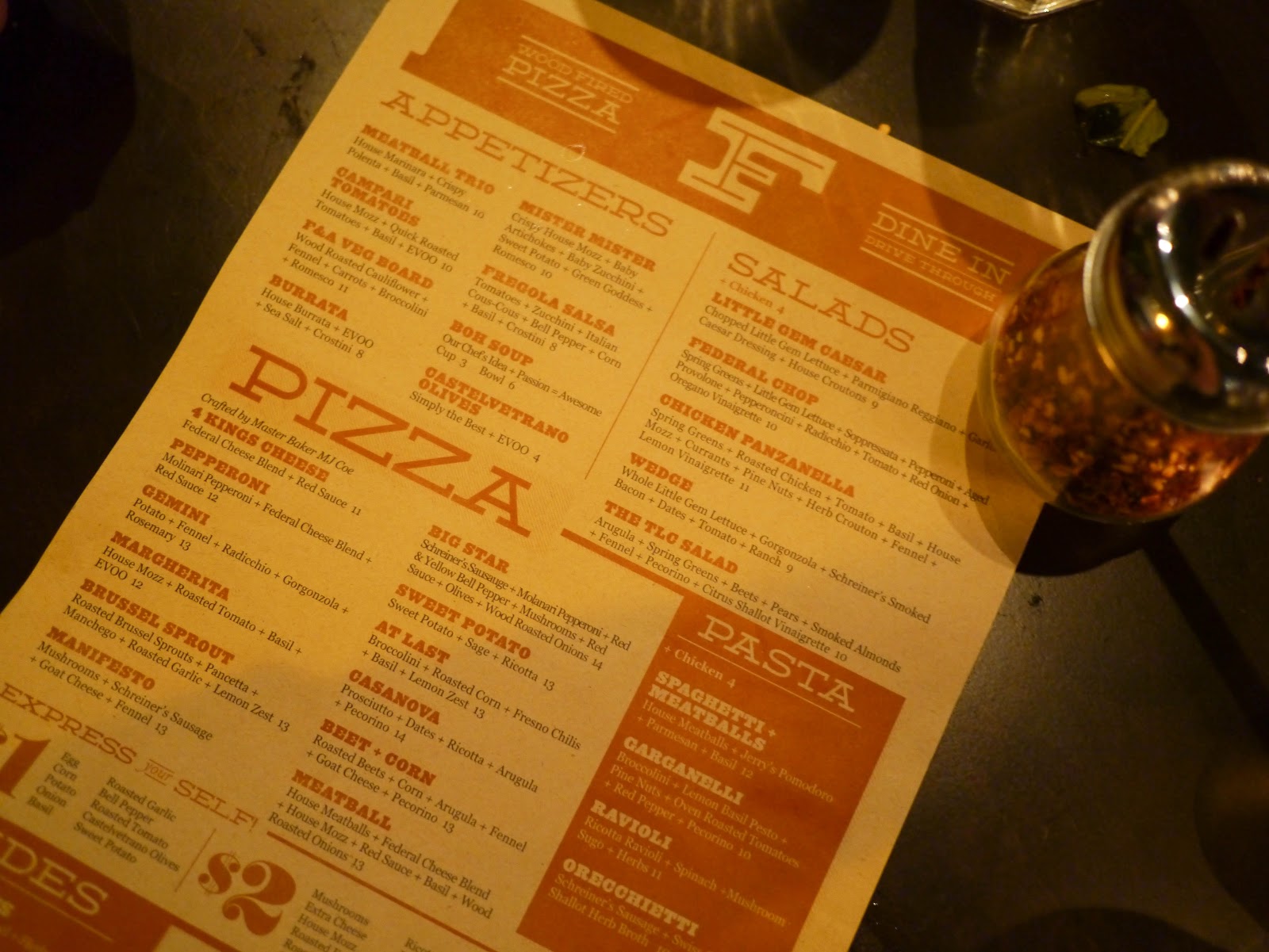 postino has a new sister restaurant and her name is Federal Pizza. located in the uber hip, up and coming North Central area of Phoenix, this spot has the cool factor of Postino and the delicious food to match. we went last friday night – a few weeks after its debut – and waited with the crowds for about an hour. it was a drizzly night, so everyone cozied up outside with cocktails during the wait. it was the place to be and we were loving it. the inside is big but cozy, has a great bar, tons of windows and a funky retro vibe without being cheesy or obvious.